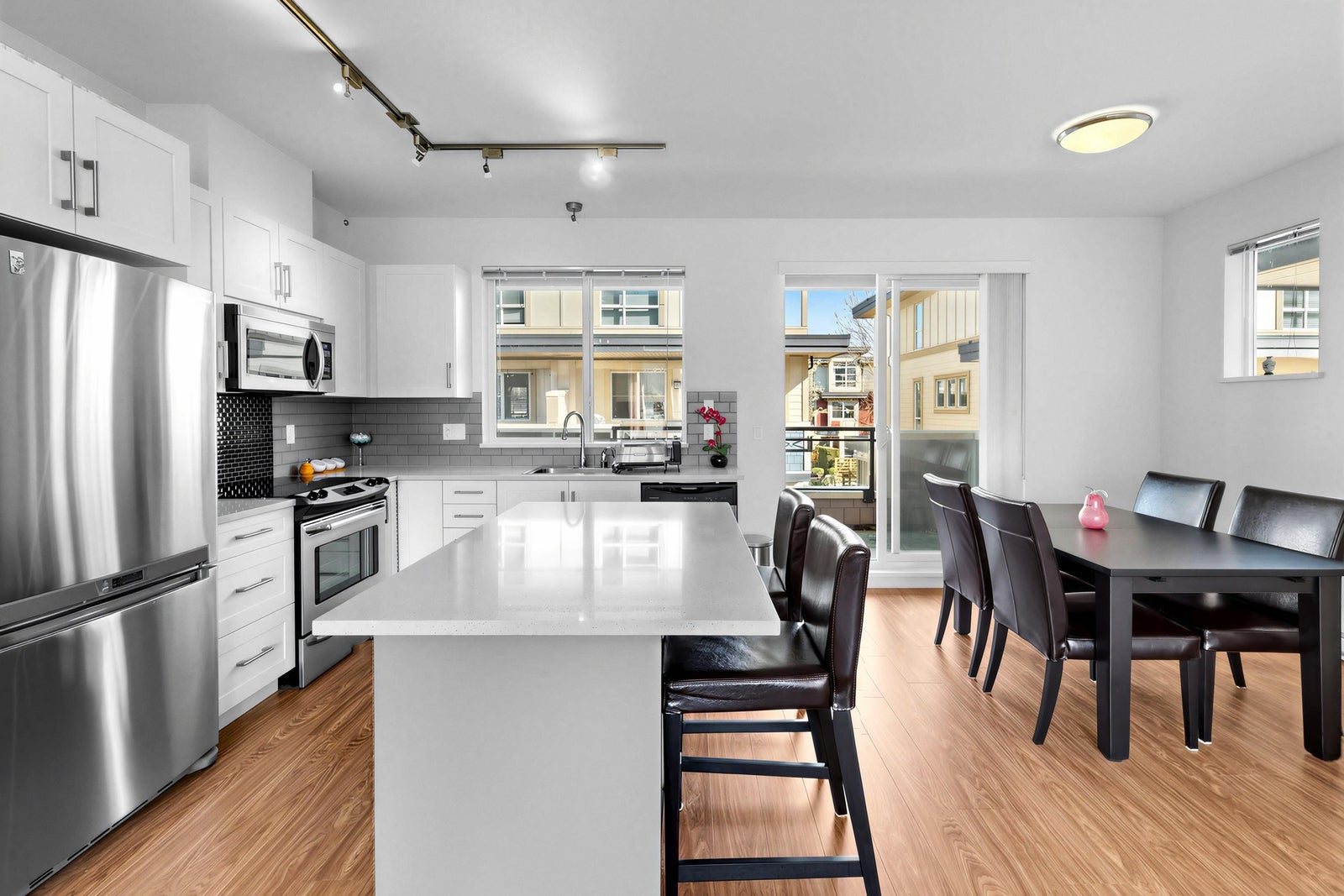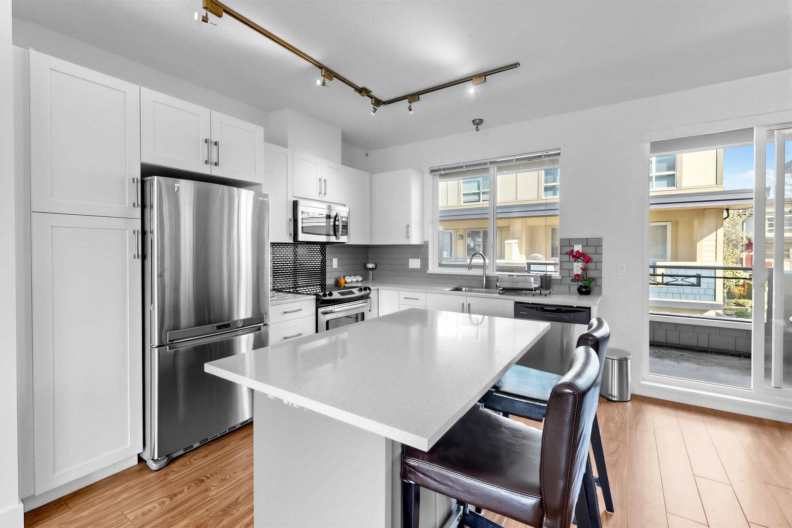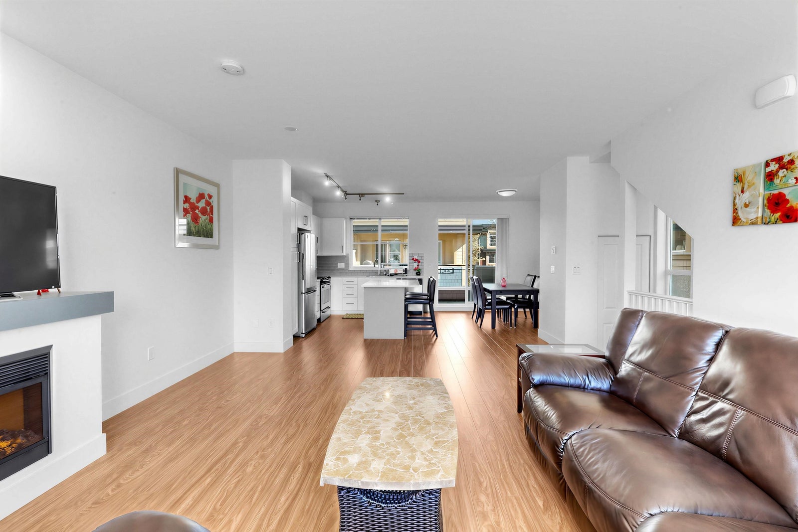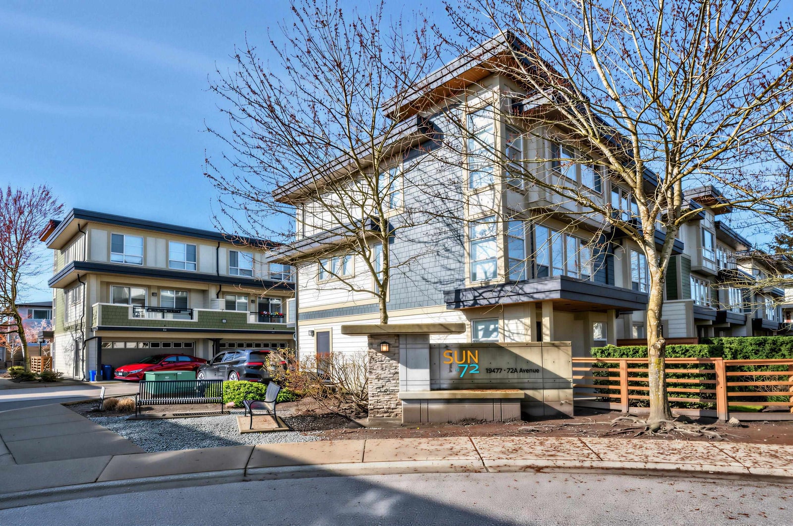 Welcome to the Sun at 72. This beautiful 1575 sq ft townhouse is a bright end unit/ duplex style with soaring ceilings & abundant windows that create a spacious & inviting feel. Offering 4 beds & 3 baths, Great maintenance by the only one owner. Dinning and huge living area with cozy fireplace. Chef inspired kitchen with quality appliances that opens to covered balcony for BBQ. The Master Bed is generous with large closet & full ensuite. The complex is conveniently located close to schools, shops & parks.