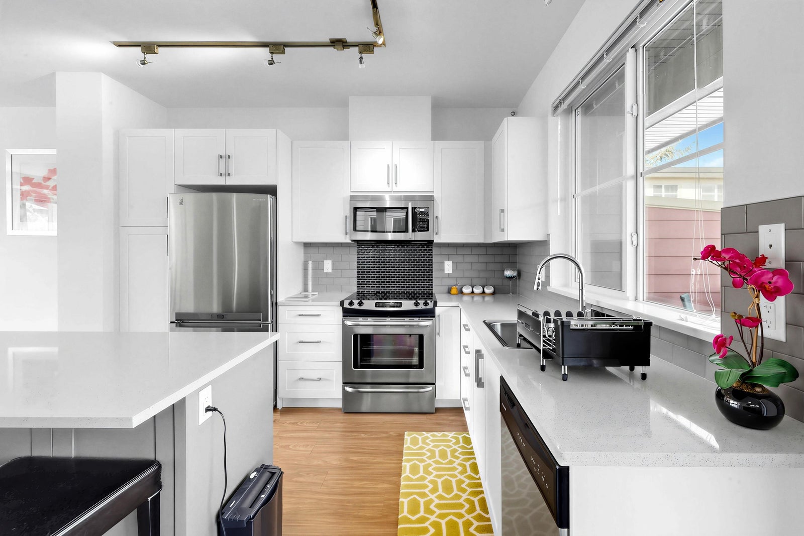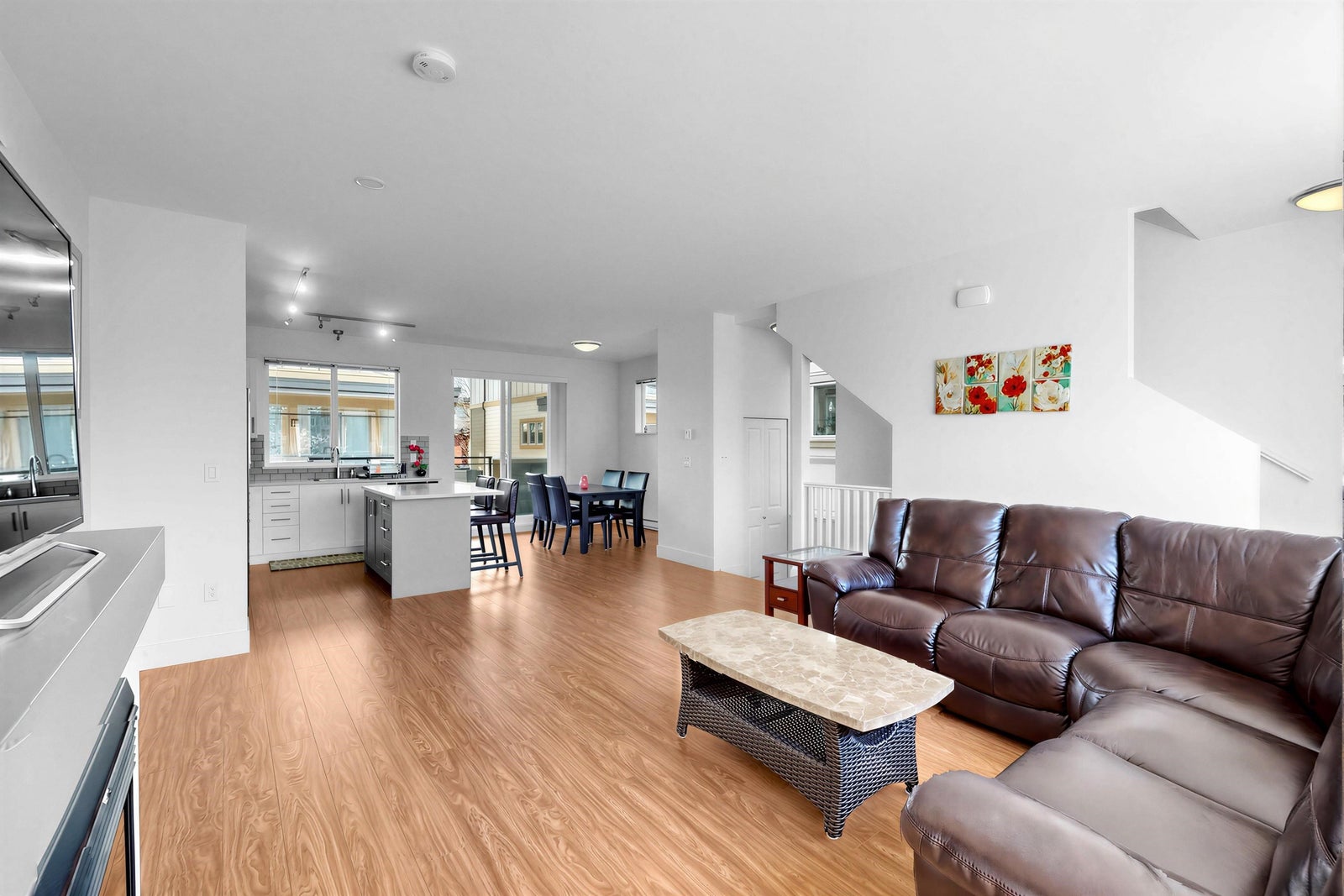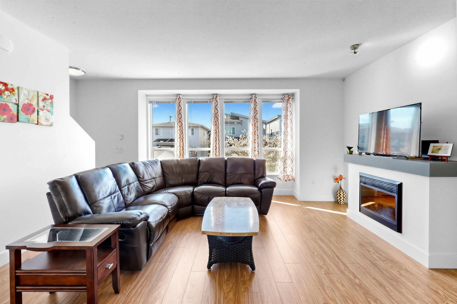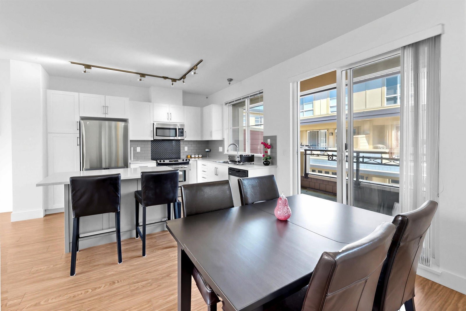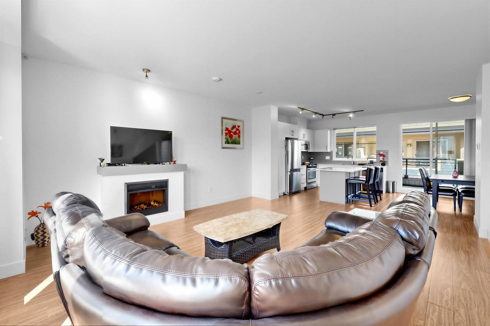 Welcome to the Sun at 72. This beautiful 1575 sq ft townhouse is a bright end unit/ duplex style with soaring ceilings & abundant windows that create a spacious & inviting feel. Offering 4 beds & 3 baths, Great maintenance by the only one owner. Dinning and huge living area with cozy fireplace. Chef inspired kitchen with quality appliances that opens to covered balcony for BBQ. The Master Bed is generous with large closet & full ensuite. The complex is conveniently located close to schools, shops & parks.